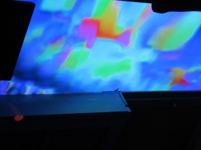 Conny Zenk projiziert mit drei Mini-Laser-Projektoren geometrische Strukturen auf Tisch, Jalousie und auf die Musiker Judith Ferstl am Kontrabass und den Trompeter Johannes Bankl.