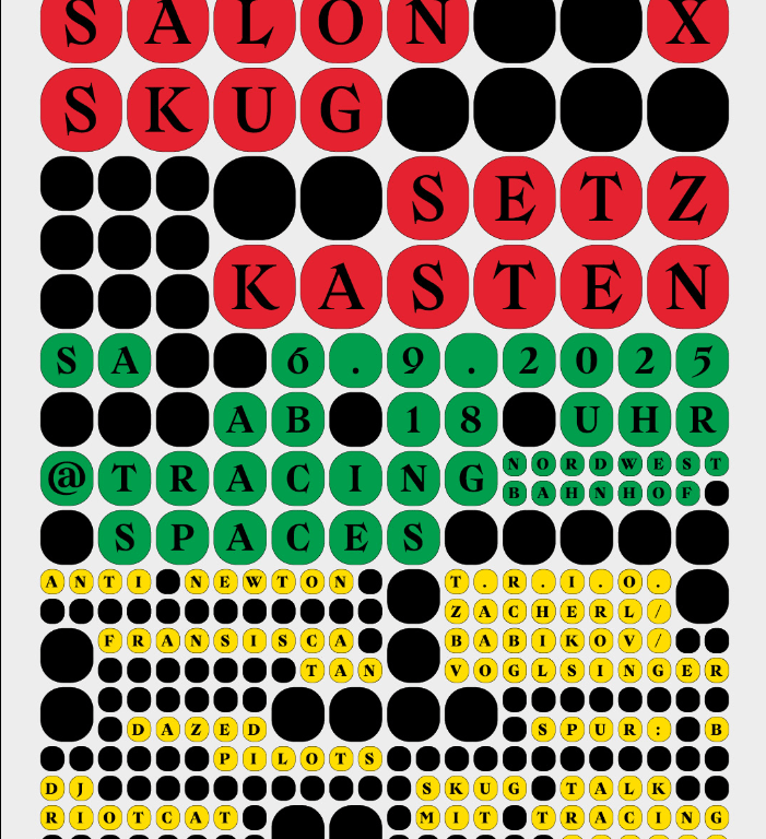 Eine verlassene Tankstelle, jede Menge Equipment, ein bisschen Diskurs – Salon skug x Setzkasten machen gemeinsame Sache. Zwischen Tankstellenhäuschen, Brache und Diesel Club erkundet das gemeinsame Festivalprogramm künstlerische Transformationen von Raum und Stadt. Mit dabei: Found-Footage-Performance Anti Newton, self-guided food meditation von Fransisca Tan, Garagenrock von Dazed Pilots, analoge Filmloops, Live-Elektronik und ein Talk mit Tracing Spaces (u.a. Michael Zinganel) über das Potenzial von Orten ohne klare Zuschreibung. Eine Skug-Kasten-Brache vielleicht? Irgendwie schon.