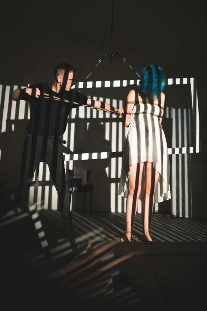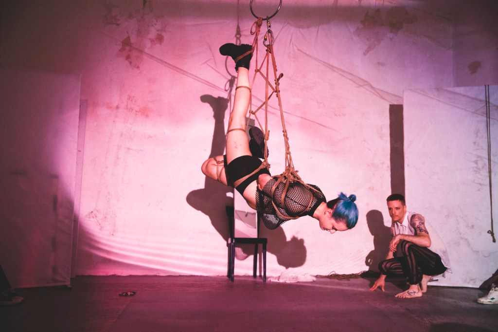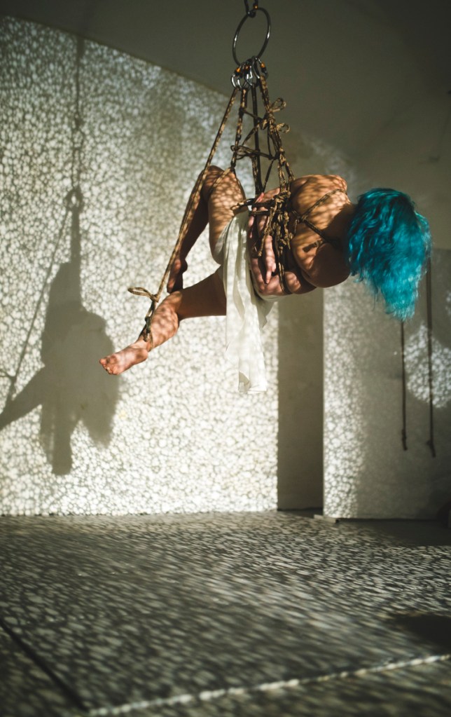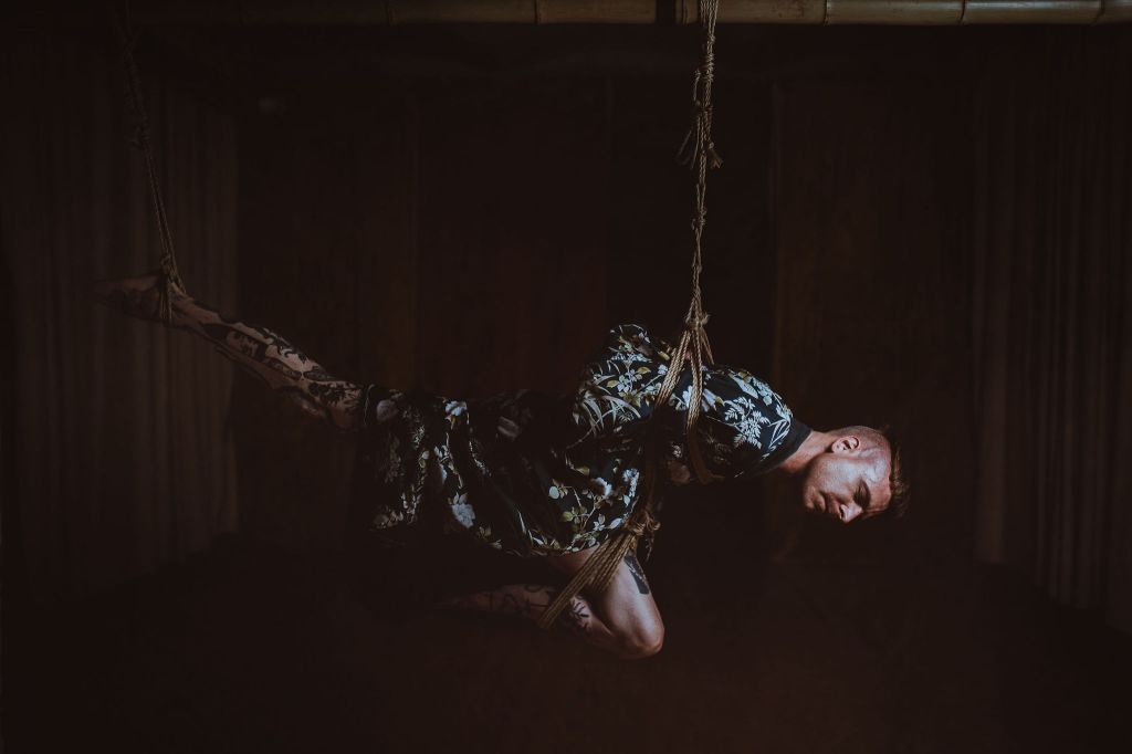 Shibari Art Aerial rope bondage performance about the beauty of falling into a surreal space. Hands on D.I.Y. ropes treating and Shibari Workshops by tico.oh.